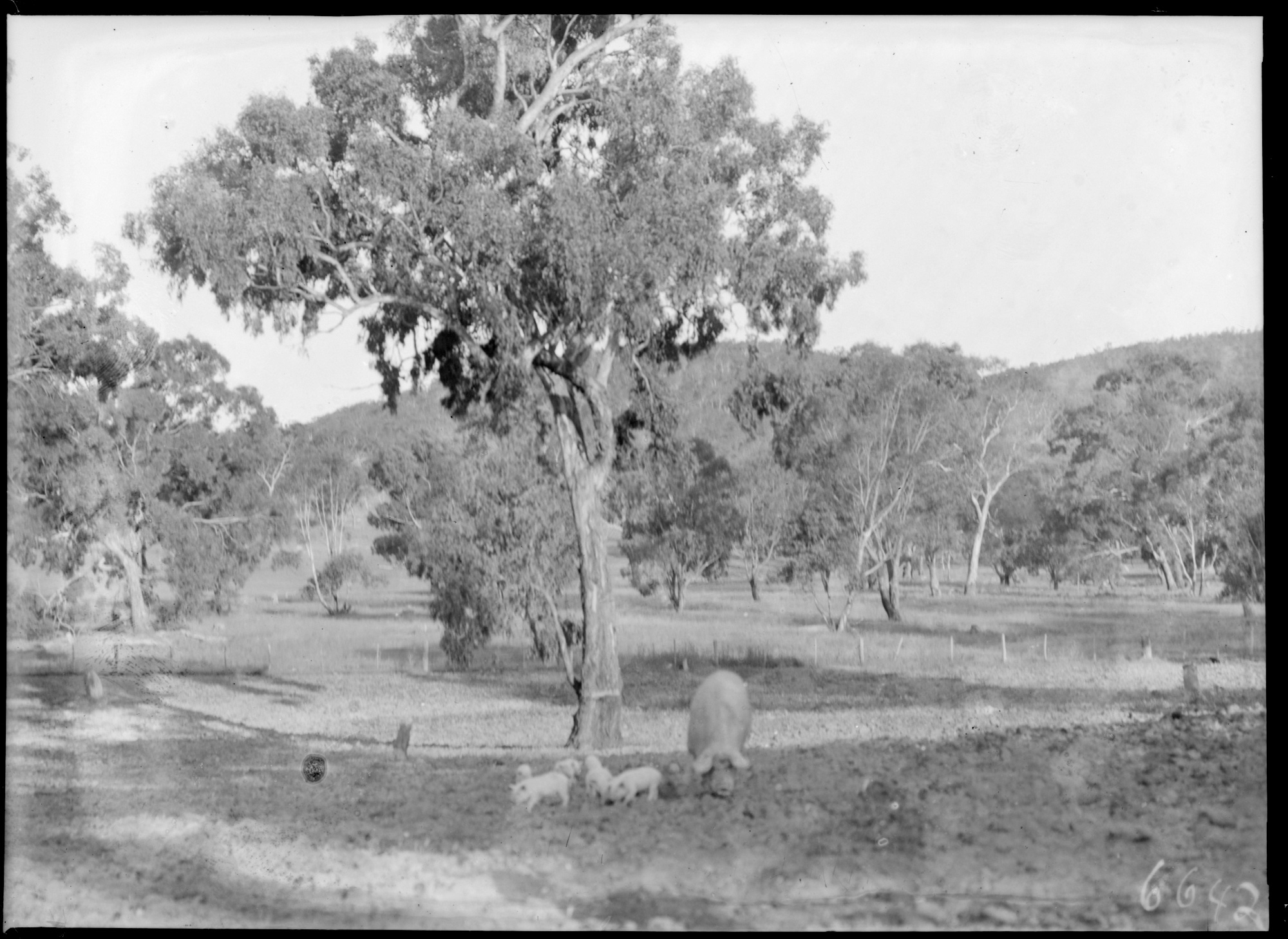 Government hog farm, Federal Highway, Watson. Large white sow with piglets.